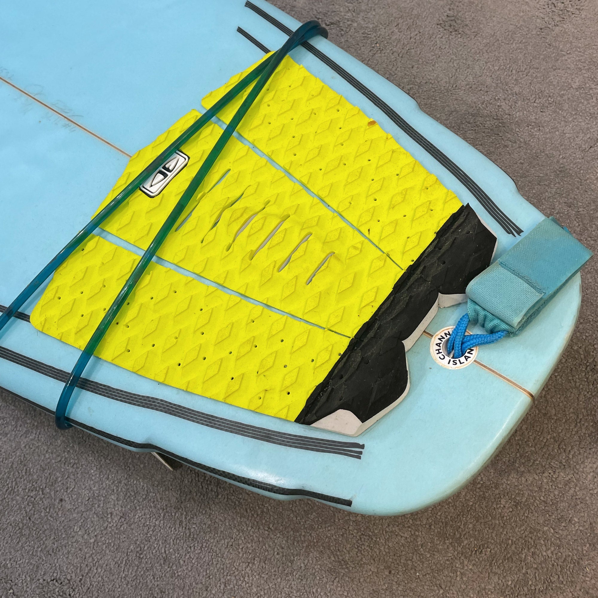 - Comes traction pad attached, FCS leash and Futures AM Fins