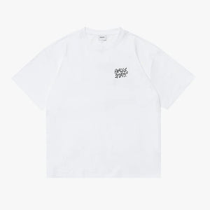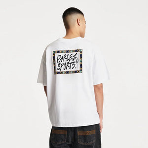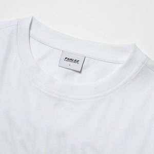 Roomy white tee in an oversized fit featuring a ribbed crew neck, short sleeves, and 100% organic cotton for soft, breathable, and durable wear, ideal for everyday layering or relaxed styling. Finished with printed branding on the chest and a bold graphic on the back, adding a distinctive touch while keeping comfort and simplicity at the forefront, brought to you by Parlez.