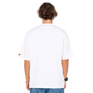 A fresh white tee from Rusty brings a relaxed, oversized fit with a classic crew neckline, short sleeves, and a subtle chest and left sleeve print that adds a clean graphic touch. Its easygoing style keeps things versatile, offering a neat look that pairs well with denim, shorts, or layered under an open overshirt for casual days and warm-weather plans.