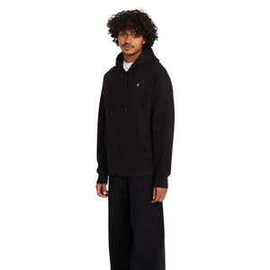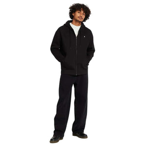 A versatile black zip hoodie with a clean, minimal look and soft fleece fabric for warm everyday wear. The full-length zipper and adjustable hood offer simple temperature control while split kangaroo pockets keep hands warm and hold small items. Ribbed cuffs and hem provide a snug fit that keeps its shape after repeated use. A subtle Volcom Stone logo on the chest adds a skate-ready detail without overpowering the style.